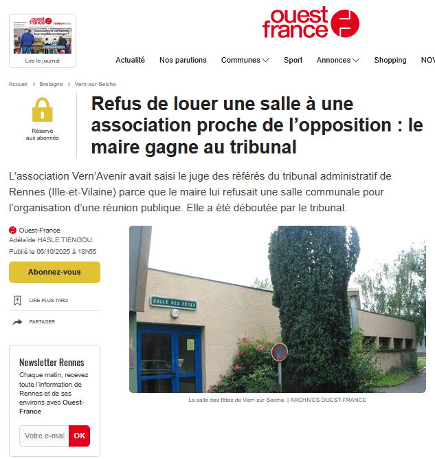 Il rejette notre requête car l’association Vern’Avenir n’est pas considérée comme un parti politique et aurait donc pu réserver des salles comme toutes autres associations vernoises »